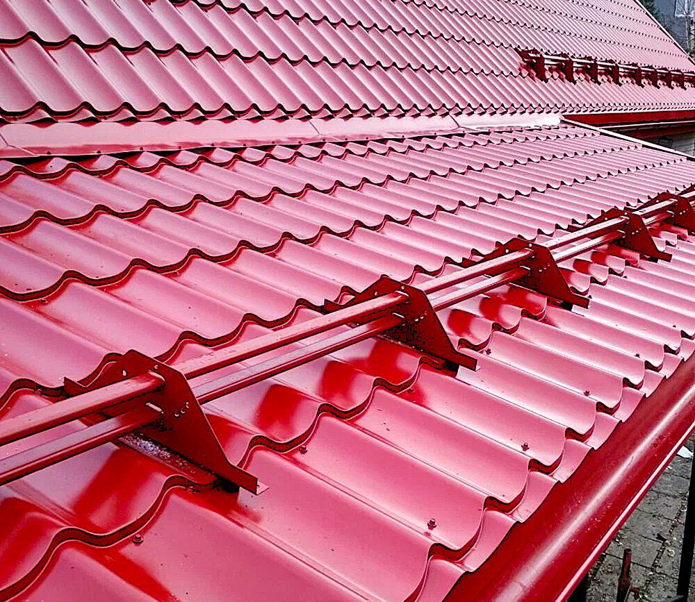 Монтаж металлочерепицы ведется на плотную обрешетку, шаг которой должен соответствовать шагу крепления кровельного материала, рекомендованному производителем, или на сплошную поверхность. Металлочерепица монтируется к обрешетке посредством окрашенных саморезов с резиновой шайбой. В местах проходок устанавливается одномодульная черепица. Помимо самого материала, в зависимости от типа и конфигурации кровли, могут потребоваться наружные и внутренние ендовы, конёк, карнизные планки и другие доборные элементы. Специалисты компании ДОМ №1 выполнят кровельные работы — смонтируют прочную красивую кровлю, которая прослужит десятилетия.